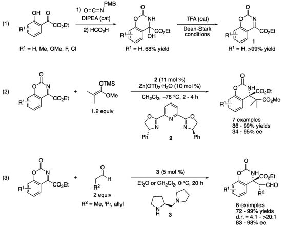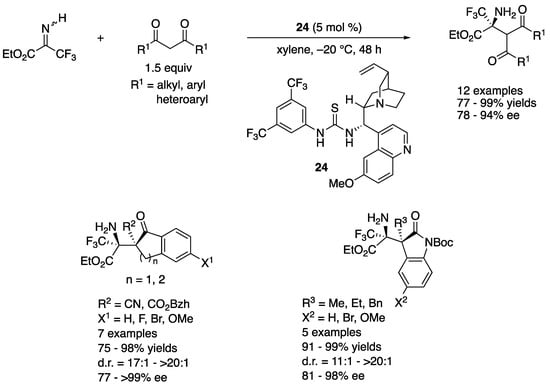 Ketimines substituted with esters, perfluorinated alkyl, or alkyne groups are relatively good electrophiles, and thus, enolates with a range of different nucleophilicities (i.e., different catalytic methods) were reported for their Mannich reactions. Nonetheless, some examples presented in this section demonstrate that seemingly subtle differences in the ketimine structures substantially affected chemical yields and stereoselectivities, highlighting the challenging nature of ketimine Mannich reactions. On the other hand, some ketimines presented herein were creatively designed so as to not only circumvent the inherent problems of unmodified ketimines but also to provide synthetically and medicinally important chiral building blocks.