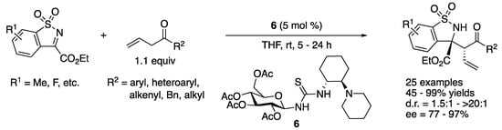 In 2015, Ma and coworkers developed a highly regio-, diastereo- and enantio-selective Mannich reaction of β,γ-unsaturated ketones with N-sulfonyl ketiminoesters by employing a saccharide-derived tertiary amino–thiourea catalyst (Scheme 5) []. The reaction scope was found broad in allylic ketones and included aryl, heteroaryl, alkenyl, benzyl, and alkyl allyl ketones, affording the corresponding products in 45–99% yields with 1.5:1–>20:1 diastereoselectivities and 77–97% ee. The β,γ-unsaturated-ketone products did not isomerize to the corresponding α,β-unsaturated ketones, which highlighted the mildness of the reaction conditions. It is noteworthy that benzyl allyl ketone provided a desired regioisomer in 64% yield.