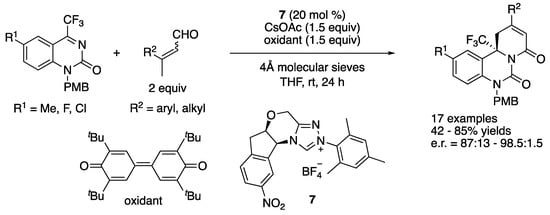 In 2017, Enders and coworkers developed an enantioselective oxidative NHC-catalyzed [4 + 2] annulation reaction of β-methyl enals and trifluoromethyl dihydroquinazolines (Scheme 6) []. The catalytically generated dienolate proved highly effective for addition to trifluoromethyl dihydroquinazolines, providing heterocyclic dihydroquinazolinone derivatives bearing a trifluoromethyl group and a tetrasubstituted stereogenic center in 42–85% yields with 87:13–98.5:1.5 enantiomeric ratios.