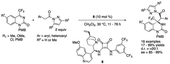 In 2018, Xu, Yuan, and coworkers developed a diastereo- and enantio-selective catalytic Mannich reaction of pyrazoleamides with trifluoromethyl dihydroquinazolines by employing a bifunctional cinchona-derived squaramide catalyst (Scheme 7) []. The method provided a wide range of trifluoromethyl dihydroquinazolinone derivatives bearing adjacent tertiary and quaternary stereogenic centers in 17–99% yields with >20:1 diastereoselectivity and 85–99% ee. It is noteworthy that they successfully demonstrated a multi-mmol scale reaction that provided 1.21 g of the desired product with no loss in yields and stereoselectivities (R1 = Cl, Ar = Ph, R2 = H, 91% yield, >20:1 d.r., 99% ee).