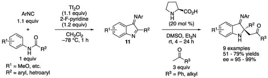 In 2019, Zheng, Ye, Huang, and coworkers reported a one-pot construction of chiral 2,2-disubstituted 3-iminoindolines (Scheme 9) []. In addition, 3-Iminoindoles (11) were generated in situ from amides and isocyanides in CH2Cl2 for 1 h, and then the resulting reaction mixtures were treated with a DMSO solution of ketones, proline and Et3N to provide the Mannich products in 51–79% yields with 95–99% ee. This method constructed 3 carbon–carbon bonds, 1 ring, and 1 nitrogen-substituted quaternary stereogenic center in one pot.