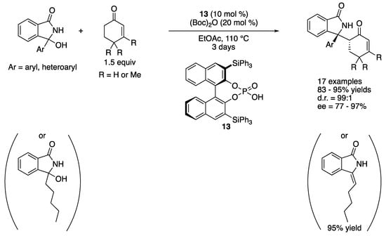 3-Aryl-3-hydroxyisoindolin-1-ones are often employed as stable precursors for the corresponding endocyclic N-carbonyl diaryl ketimines. This class of ketimines is useful synthons to access chiral isoindolin-1-ones that are an important motif found in numerous biologically relevant molecules and natural products. In 2019, Reddy and coworkers reported BINOL phosphoric acid-catalyzed Mannich reaction of endocyclic N-acyl ketimines generated in situ from 3-hydroxyisoindolin-1-ones (Scheme 11) []. The method provided chiral isoindolin-1-ones bearing adjacent quaternary and tertiary stereogenic centers in 83–95% yields with excellent stereoselectivities despite the high reaction temperature (99:1 diastereoselectivity for all substrates and 77–97% ee). They noted that 3-hydroxy-3-pentylisoindoline-1-one (i.e., a tautomerizable ketimine) provided the corresponding enamide in 95% in 4 h without the desired Mannich product under the optimized condition.