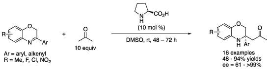 In 2013, Wang and coworkers described the proline-catalyzed direct asymmetric Mannich reaction of 3-substituted-2H-1,4-benzoxazines (Scheme 12) []. This work represents the first catalytic asymmetric Mannich reaction of 3,4-dihydro-2H-1,4-benzoxazines and provided the N-heterocyclic products in 48–94% yields with 61–>99% ee. The authors pointed out that the ring strain in 3,4-dihydro-2H-1,4-benzoxazines contributed to their reactivities. It is still notable that these ketimines bear no electron-withdrawing substituents in sharp contrast to the ketimines discussed earlier in this review. It is worthy of mention that the same transformation catalyzed by wheat germ lipase was reported by Guan, He, and coworkers in 2016 (not shown) [].