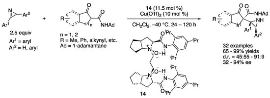 In 2019, Yin and coworkers reported a copper(I)-catalyzed asymmetric decarboxylative Mannich reaction of 2H-azirines (Scheme 14) []. This method utilized a 2H-azirine not only as an electrophile but also as a base to deprotonate a cyanoacetic acid to induce its decarboxylation (i.e., decarboxylative enolization). As such, a reacting electrophile was a protonated 2H-azirine whose electrophilicity was enhanced. Importance of this “proton transfer” strategy was successfully demonstrated by showing that a nonprotonated 2H-azirine did not react with a corresponding nucleophile under the otherwise identical reaction condition. The reaction scope was very broad and tolerated various substituents on both nucleophiles and electrophiles, affording various enantio-enriched aziridines in 73–99% yields with 2.4:1–>20:1 diastereoselectivities and 91–98% ee. Furthermore, the method worked on a gram-scale reaction with only 2 mol% catalyst loading without any loss in stereoselectivities; albeit, it took 50 h (R1 = Ph, R2 = Me, Ar = Ph, 91% yield, >20:1 d.r., 97% ee).