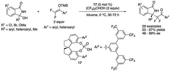 In 2020, Zhang, Ma, and coworkers reported a chiral phosphoric acid-catalyzed Mukaiyama–Mannich reaction of endocyclic N-acyl ketimines generated in situ from 3-hydroxyisoindolin-1-ones (Scheme 16) []. They employed difluorinated silyl enol ethers as nucleophiles to prepare enantioenriched fluoroalkyl-functionalized isoindolones. During the screening of reaction conditions and chiral phosphoric acid catalysts, they found that (1) the use of hexafluoroisopropyl alcohol as additive was beneficial for both reactivity and enantioselectivity and (2) catalysts bearing trifluoromethylated chiral barriers (Ar2) were superior to counterparts having no trifluoromethyl group. As such, they tested a nonfluorinated silyl enol ether (F = H, Ar1 = Ph) under the optimized reaction conditions and found it unreactive. The scope of both ketimines and silyl enol ethers were broad, and the Mannich products were obtained in 55–97% yields with 48–99% ee. It is noteworthy that their method tolerated a tautomerizable ketimine (R2 = Me), giving the corresponding product (R1 = H, Ar1 = Ph) in 85% yield with 48% ee (see Scheme 11 for comparison). Furthermore, a gram-scale reaction was successfully demonstrated (R1 = H, R2 = Ar1 = Ph, 98% yield, and 96% ee).