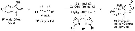 In 2018, Morimoto, Ohshima, and coworkers reported a decarboxylative Mannich reaction of N-unprotected isatin-derived ketimines, which directly afforded enantio-enriched chiral oxindoles bearing primary amines at their 3-postions (Scheme 17) []. The method that can accommodate substrates that have no protecting groups are more step- and atom-economical than the counterparts that require them [,,]. The method tolerated various ketoacids, affording the Mannich products in 69–99% yields with 79–96% ee. Their preliminary mechanistic study indicated that the addition of a ketoacid to a ketimine preceded the decarboxylation process with their catalytic system.