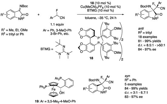 In 2019, Wolf and coworkers developed a copper-catalyzed stereodivergent asymmetric Mannich reaction of isatin-derived ketimines and α-fluoro-α-arylnitriles (Scheme 18) []. A chiral cuprous keteniminate complex generated from α-fluoro-α-arylnitrile, a chiral copper catalyst, and BTMG was proposed as a nucleophile. The Segphos (18)–copper complex provided anti diastereomers in 81–99% yields with 8.5:1–>50:1 diastereoselectivities and 84–97% ee. On the other hand, the Taniaphos (19) complex afforded syn diastereomers in 84–99% yields with 3:1–6.7:1 diastereoselectivities and 83–97% ee. The switching of diastereoselectivities was successfully demonstrated by choosing a proper combination of the chiral ligand and the isatin N-protecting group (trityl or phenyl). Furthermore, a gram-scale reaction (R1 = H, R2 = trityl, Ar = Ph, 99% yield, 12.7:1 d.r., 90% ee) was successfully carried out without compromising yield and stereoselectivities.