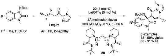 In 2020, Liu, Feng and coworkers described several Lewis acid-catalyzed enantioselective transformations of β,γ-unsaturated 2-acyl imidazoles; the study of which included ketimines as electrophiles (Scheme 19) []. After the screening of the reaction conditions, the catalyst complex generated from La(OTf)3 and (S)-pipecolic acid-derived ligand was found to promote the Mannich reaction of isatin-derived ketimines and β,γ-unsaturated 2-acyl imidazoles, delivering the desired β-amino 2-acyl imidazoles as single regio- and diastereo-isomers in 75–99% yields and 88–91% ee. The pyrazolinone-derived ketimines were also demonstrated to be good substrates for their method (not shown).