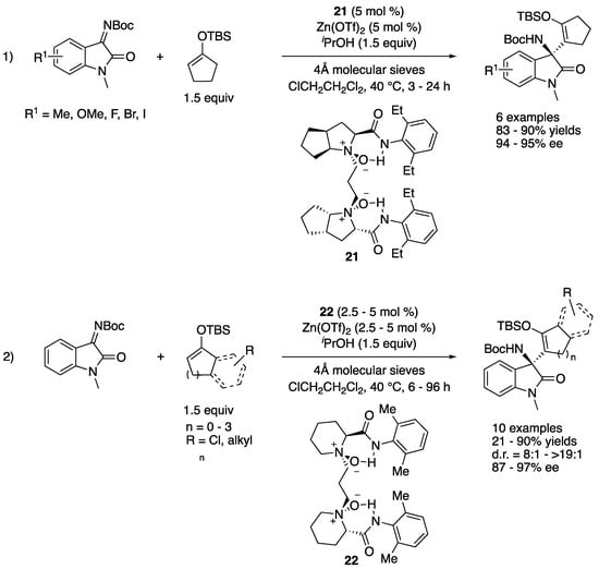 In 2019, Feng and coworkers reported a serendipitously discovered tandem α-alkenyl addition/proton shift reaction of silyl enol ethers and ketimines catalyzed by chiral N,N’-dioxide/Zn(II) complexes (Scheme 20) []. After the optimization of reaction conditions, dioxide 21 was found to be optimal for a series of isatin-derived ketimines (1), giving the products in 83–90% yields with 94–95% ee. A gram-scale reaction (R1 = H) was successfully demonstrated without compromising yield and stereoselectivity (86% yield and 95% ee). With respect to the scope of silyl enol ethers, dioxide 22 turned out best and provided the products in 21–90% yields with 87–97% ee and 8:1–>19:1 diastereoselectivities (for racemic α’-substituted cyclic silyl enol ethers that required 10 mol% catalyst loadings). The pyrazolinone-derived ketimines were also demonstrated to be good substrates for the method (not shown). Their preliminary mechanistic study strongly supported that the Mukaiyama–Mannich addition intermediates got protonated by isopropanol (additive) before the subsequent silyl shift, giving the corresponding β-amino silyl enol ethers.