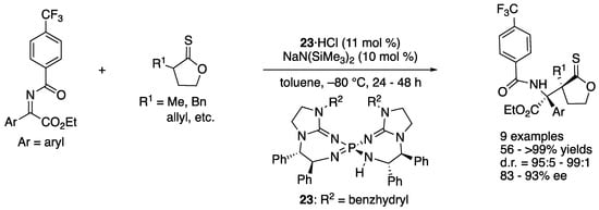 In 2016, Terada and coworkers developed a novel asymmetric direct Mannich reaction of ketiminoesters with thionolactones using bis(guanidino)iminophosphorane 23 as a chiral organosuperbase catalyst (Scheme 21) []. Thionolactones were identified as suitable nucleophiles, while a corresponding lactone did not undergo the reaction. It was presumed that a lactone was not acidic enough to get enolized by the base catalyst. With respect to the electrophiles, the substituent on the benzoyl protecting group was found crucial for both chemical yield and diastereoselectivity. For example, a corresponding methoxy-substituted ketiminoester (CF3 = OMe) provided the product in much lower yield and selectivity (Ar = p-tol: for CF3, 93% yield, d.r. = 95:5; for OMe, 35% yield, d.r. = 88:12). Under the optimized conditions, the method provided the products with vicinal quaternary stereogenic centers in 56–>99% yields with 95:5–99:1 diastereoselectivities and 83–93% ee.