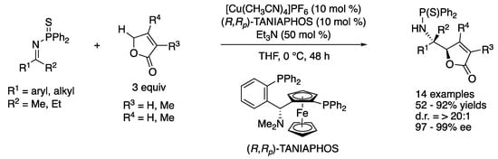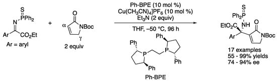 As part of their longstanding interests in the soft Lewis acid/hard Brønsted base cooperative catalysis, in 2016 Kumagai, Shibasaki, and a coworker developed the direct catalytic asymmetric Mannich reaction of an α,β-unsaturated γ-butyrolactam with ketiminoesters (Scheme 22) []. This method was found to give the α-addition products (aza-Morita–Baylis–Hillman type products) through the regioselective α-addition of the dienolate intermediate followed by isomerization of a double bond. This work represents the first α-addition of α,β-unsaturated γ-butyrolactams to ketimines under the asymmetric catalysis conditions. The interaction of the soft Lewis acidic copper catalyst and soft Lewis basic thiophosphinoyl protecting group of ketimines was suggested crucial for the success of this Mannich reaction, because a corresponding phosphinoyl protected ketiminoester did not react under the otherwise identical reaction conditions. These observations were consistent with their earlier works on the soft Lewis acid/hard Brønsted base cooperative catalysis (vide infra). The method accommodated 17 ketiminoesters and provided the β-amino carbonyl products in 55–99% yields with 74–94% ee. A gram-scale reaction was demonstrated without any loss in yield or ee (Ar = Ph, 99% yield, 91% ee).