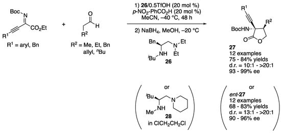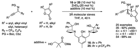 In 2018, Trost and coworkers developed a Zn-ProPhenol catalyzed asymmetric Mannich reaction of α,β- and β,γ-butenolides with perfluoroalkyl alkynyl ketimines (Scheme 24) []. The method provided vinylogous products bearing two contiguous tetrasubstituted stereogenic centers. This represents the first successful use of ketimines in the ProPhenol Mannich process. They noted the salient features of perfluoroalkyl alkynyl ketimines; (1) a fluorinated group makes ketimines more electrophilic; (2) an alkyne is sterically much less demanding and its higher s character should further enhance the electrophilicity of ketimines; and (3) the increased steric differences between alkynyl and perfluoroalkyl groups would give ketimines in a single diastereomeric form, which is critical for high stereoselectivities. The reaction scope was very broad, providing the medicinally important (i.e., perfluoroalkyl groups) and synthetically versatile (i.e., alkynes) Mannich products in 35–92% yields with 4:1–>50:1 diastereoselectivities, 4:1–>50:1 regioselectivities, and 54–99% ee.