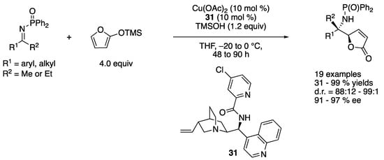 - Hayashi, M.; Sano, M.; Funahashi, Y.; Nakamura, S. Cinchona Alkaloid Amide/Copper(II) Catalyzed Diastereo- and Enantioselective Vinylogous Mannich Reaction of Ketimines with Siloxyfurans. Angew. Chem. Int. Ed. 2013, 52, 5557–5560. [Google Scholar] [CrossRef]