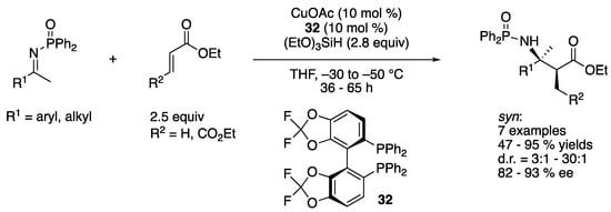 - Du, Y.; Xu, L.-W.; Shimizu, Y.; Oisaki, K.; Kanai, M.; Shibasaki, M. Asymmetric Reductive Mannich Reaction to Ketimines Catalyzed by a Cu(I) Complex. J. Am. Chem. Soc. 2008, 130, 16146–16147. [Google Scholar] [CrossRef] [PubMed]