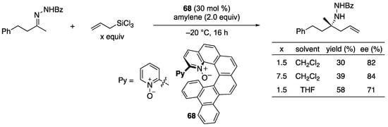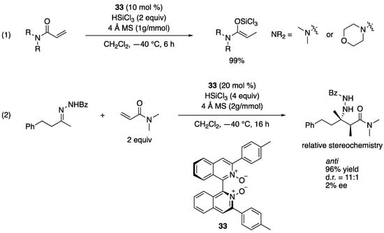 - Reep, C. Development of Axial-Chiral Lewis Base Catalysts for Asymmetric Synthesis. Ph.D. Thesis, Florida Institute of Technology, Melbourne, FL, USA, July 2021. (in preparation) Experimental Data: A round-bottom flask with a stir bar was flame-dried then charged with (R)-3,3′-bis(4-methylphenyl)-1,1′-biisoquinoline N,N′-dioxide (12 mg, 0.025 mmol), activated 4 Å molecular sieves powder (250 mg, g/mmol) and CH2Cl2 freshly distilled over CaH2 (750 μL). The mixture was stirred for 1 h at rt, cooled to –78 °C and then treated with a solution of trichlorosilane freshly distilled over CaH2 (51 µL, 0.5 mmol) in CH2Cl2 (125 μL). The resulting solution was stirred for 15 min at –78 °C. N,N-Dimethylacrylamide that was distilled over CaH2 and stored in a Schlenk flask over 4 Å molecular sieves (26 µL, 0.25 mmol) was added as a solution in CH2Cl2 (125 µL). The mixture was stirred for 15 min at –78 °C and then treated with a solution of benzylacetone-derived hydrazone (33 mg, 0.124 mmol) in CH2Cl2 (500 µL). The reaction mixture was stirred for 16 h at –40 °C, then quenched by pouring into saturated NaHCO3 solution cooled to 0 °C. The mixture was filtered into a separatory funnel via a short pad of celite, extracted with CH2Cl2, dried over Na2SO4, and concentrated In Vacuo. The yields of anti- and syn-31 were determined by 1H NMR using 1,1,2,2-tetrachloroethane (53 µL, 0.5 mmol) as an internal standard in CDCl3 (anti-31, 88%; syn-31, 8%), then purified by preparative TLC. anti-31: 1H NMR (400 MHz, CDCl3) δ 10.82 (br s, 1H), 7.9-7.88 (m, 2H), 7.47-7.41 (m, 3H), 7.20-7.17 (m, 2H), 7.14-7.10 (m,1H), 7.05 (d, J. = 6.8 Hz, 2H), 5.36 (br s, 1H), 3.10 (s, 3H), 2.99 (s, 3H), 2.95 (q, J. = 6.8 Hz, 1H), 2.71 (dt, J. = 4.4, 12.8 Hz, 1H), 2.57 (dt, J. = 5.2, 12.4, Hz, 1H), 1.92 (dt, J. = 4.4, 12.8 Hz, 1H), 1.61-1.53 (m, 1H), 1.31 (d, J. = 6.4 Hz, 3H), 1.30 (s, 3H); 13C NMR (100 MHz, CDCl3) δ 176.9, 162.8, 142.3, 133.4, 130.9, 128.5, 128.5, 128.4, 126.8, 125.7, 59.7, 44.8, 38.5, 38.2, 36.3, 29.9, 23.4, 13.5; HRMS (ESI): Exact mass calculated for C22H29N3NaO2+ [M + Na]+ expected: 390.2152, found: 390.2186; HPLC analysis, e.r. = 51:49, tR (major) 26.7 min, tR (minor) 35.6 min (Daicel Chiralcel® AS-H with an AS-H guard column, hexane/2-propanol = 80:20, 0.5 mL/min); See ref. 105 for its X-ray crystallographic data for structural analysis. [Google Scholar]