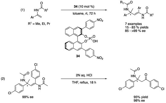 - Baudequin, C.; Zamfir, A.; Tsogoeva, S.B. Highly enantioselective organocatalytic formation of a quaternary carbon center via chiral Brønsted acid catalyzed self-coupling of enamides. Chem. Commun. 2008, 4637–4639. [Google Scholar] [CrossRef] [PubMed]