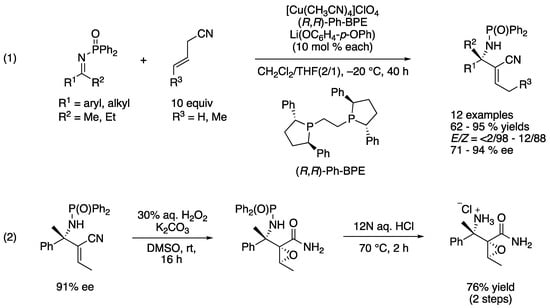 - Yazaki, R.; Nitabaru, T.; Kumagai, N.; Shibasaki, M. Direct Catalytic Asymmetric Addition of Allylic Cyanides to Ketoimines. J. Am. Chem. Soc. 2008, 130, 14477–14479. [Google Scholar] [CrossRef] [PubMed]