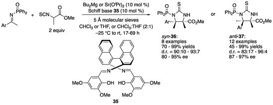 - Lu, G.; Yoshino, T.; Morimoto, H.; Matsunaga, S.; Shibasaki, M. Stereodivergent Direct Catalytic Asymmetric Mannich-Type Reactions of α-Isothiocyanato Ester with Ketimines. Angew. Chem. Int. Ed. 2011, 50, 4382–4385. [Google Scholar] [CrossRef] [PubMed]