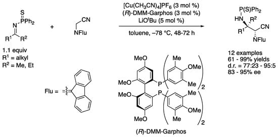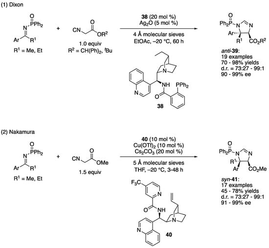 - De la Campa, R.; Gammack Yamagata, A.D.; Ortín, I.; Franchino, A.; Thompson, A.L.; Odell, B.; Dixon, D.J. Catalytic enantio- and diastereoselective Mannich reaction of α-substituted isocyanoacetates and ketimines. Chem. Commun. 2016, 52, 10632–10635. [Google Scholar] [CrossRef]