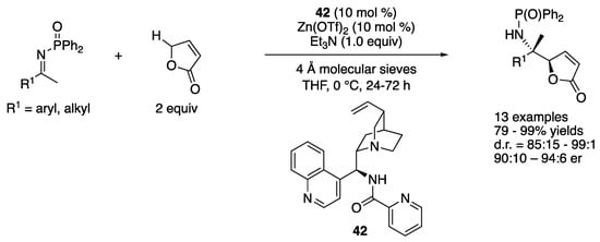 - Nakamura, S.; Yamaji, R.; Hayashi, M. Direct Enantioselective Vinylogous Mannich Reaction of Ketimines with γ-Butenolide by Using Cinchona Alkaloid Amide/Zinc(II) Catalysts. Chem. A Eur. J. 2015, 21, 9615–9618. [Google Scholar] [CrossRef]