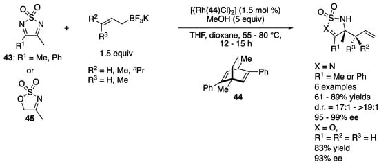 - Hepburn, H.B.; Lam, H.W. The Isomerization of Allylrhodium Intermediates in the Rhodium-Catalyzed Nucleophilic Allylation of Cyclic Imines. Angew. Chem. Int. Ed. 2014, 53, 11605–11610. [Google Scholar] [CrossRef]