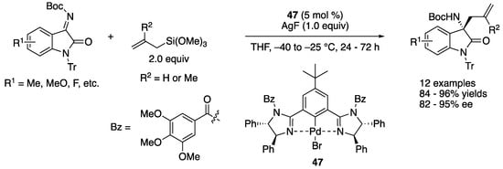 3-substituted-3-aminooxindoles are an important structural motif found in numerous natural products and biologically relevant molecules. The catalytic asymmetric Mannich reaction of isatin-derived ketimines provides direct access to enantio-enriched 3-substituted-3-aminooxindoles. Furthermore, isatin-derived ketimines are relatively reactive electrophiles. As such, many catalytic asymmetric Mannich reactions of isatin-derived ketimines have been reported. In light of the excellent review articles that covered up to the end of 2017 [,,], we discuss herein a few selected examples published after that period (for other selected examples, see: [,,,,,,,,]).