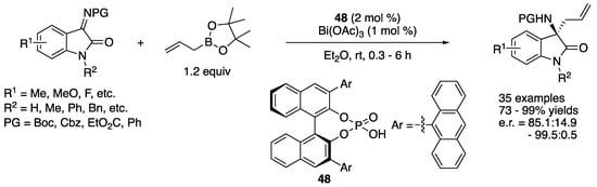 - Wang, J.; Zhang, Q.; Zhou, B.; Yang, C.; Li, X.; Cheng, J.-P. Bi(III)-Catalyzed Enantioselective Allylation Reactions of Ketimines. Iscience 2019, 16, 511–523. [Google Scholar] [CrossRef] [PubMed]