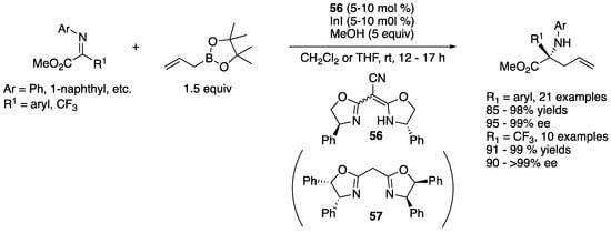 - Wada, R.; Shibuguchi, T.; Makino, S.; Oisaki, K.; Kanai, M.; Shibasaki, M. Catalytic Enantioselective Allylation of Ketoimines. J. Am. Chem. Soc. 2006, 128, 7687–7691. [Google Scholar] [CrossRef] [PubMed]