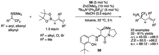 - Fager, D.C.; Morrison, R.J.; Hoveyda, A.H. Regio- and Enantioselective Synthesis of Trifluoromethyl-Substituted Homoallylic α-Tertiary NH2-Amines by Reactions Facilitated by a Threonine-Based Boron-Containing Catalyst. Angew. Chem. Int. Ed. 2020, 59, 11448–11455. [Google Scholar] [CrossRef] [PubMed]