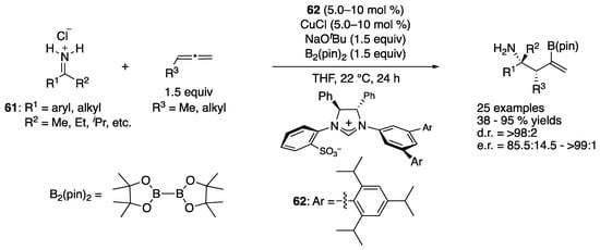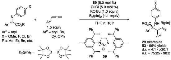 - Zhao, C.-Y.; Zheng, H.; Ji, D.-W.; Min, X.-T.; Hu, Y.-C.; Chen, Q.-A. Copper-Catalyzed Asymmetric Carboboronation of Allenes to Access α-Quaternary Amino Esters with Adjacent Stereocenters. Cell Rep. Phys. Sci. 2020, 1, 100067. [Google Scholar] [CrossRef]