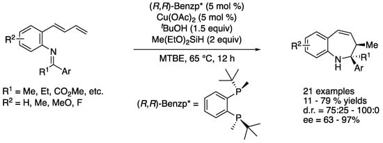- Li, D.; Park, Y.; Yoon, W.; Yun, H.; Yun, J. Asymmetric Synthesis of 1-Benzazepine Derivatives via Copper-Catalyzed Intramolecular Reductive Cyclization. Org. Lett. 2019, 21, 9699–9703. [Google Scholar] [CrossRef] [PubMed]