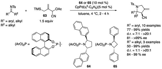 - Trost, B.M.; Silverman, S.M. Enantioselective Construction of Highly Substituted Pyrrolidines by Palladium-Catalyzed Asymmetric [3+2] Cycloaddition of Trimethylenemethane with Ketimines. J. Am. Chem. Soc. 2010, 132, 8238–8240. [Google Scholar] [CrossRef] [PubMed]