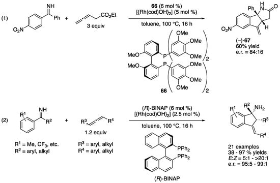 - Tran, D.N.; Cramer, N. syn-Selective Rhodium(I)-Catalyzed Allylations of Ketimines Proceeding through a Directed C-H Activation/Allene Addition Sequence. Angew. Chem. Int. Ed. 2010, 49, 8181–8184. [Google Scholar] [CrossRef]