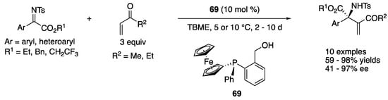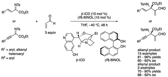 - Hu, F.-L.; Shi, M. The highly enantioselective catalytic aza-Morita–Baylis–Hillman reaction. Org. Chem. Front. 2014, 1, 587–595. [Google Scholar] [CrossRef]