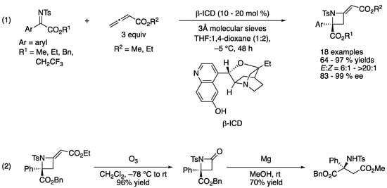 - Takizawa, S.; Arteaga, F.A.; Yoshida, Y.; Suzuki, M.; Sasai, H. Organocatalyzed Formal [2 + 2] Cycloaddition of Ketimines with Allenoates: Facile Access to Azetidines with a Chiral Tetrasubstituted Carbon Stereogenic Center. Org. Lett. 2013, 15, 4142–4145. [Google Scholar] [CrossRef]