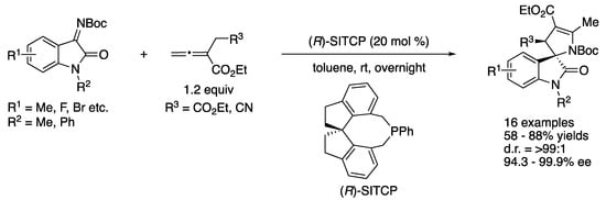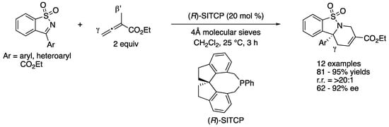 - Takizawa, S.; Arteaga, F.A.; Yoshida, Y.; Suzuki, M.; Sasai, H. Enantioselective Organocatalyzed Formal [4 + 2] Cycloaddition of Ketimines with Allenoates: Easy Access to a Tetrahydropyridine Framework with a Chiral Tetrasubstituted Stereogenic Carbon Center. Asian J. Org. Chem. 2014, 3, 412–415. [Google Scholar] [CrossRef]