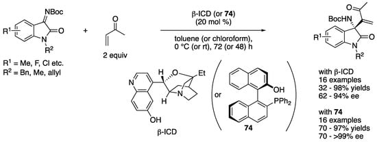 - Zhao, X.; Li, T.-Z.; Qian, J.-Y.; Sha, F.; Wu, X.-Y. Enantioselective aza-Morita–Baylis–Hillman reaction between acrylates and N-Boc isatin ketimines: Asymmetric construction of chiral 3-substituted-3-aminooxindoles. Org. Biomol. Chem. 2014, 12, 8072–8078. [Google Scholar] [CrossRef] [PubMed]