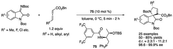 - Sankar, M.G.; Garcia-Castro, M.; Golz, C.; Strohmann, C.; Kumar, K. Engaging Allene-Derived Zwitterions in an Unprecedented Mode of Asymmetric [3+2]-Annulation Reaction. Angew. Chem. Int. Ed. 2016, 55, 9709–9713. [Google Scholar] [CrossRef] [PubMed]