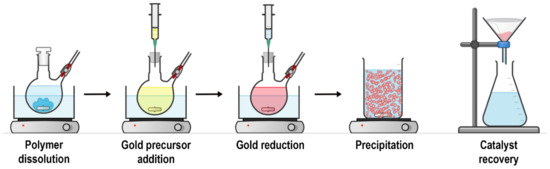 The pioneering synthesis of polymer-stabilized AuNPs can be attributed to Faraday, who first used gelatin as both protective and reducing agent of the gold precursors [48]; this synthetic method has been almost completely abandoned after Turkevich [49] and Frens [50] described the synthesis of narrowly size dispersed AuNPs using citrate as reductant and alkylthiols as stabilizing agent in monophasic or biphasic solvents. The synthesis of polymer-supported AuNPs can be further classified in physical-chemical methods [24,51] and chemical wet methods [20,52,53,54]. Physical-chemical methods comprise ex-situ synthesis where the metal particles are generated externally to the polymer and then mixed together [55] and in situ synthesis of AuNPs-polymer composites obtained via reduction of a gold precursor in the presence of the polymer. The latter approach is simple, rapid, cost-effective, does not require sophisticated equipment, and leads to the synthesis of well-controlled sizes and shapes of AuNPs to be applied in catalysis [17,20,24,53,56,57,58,59,60,61].