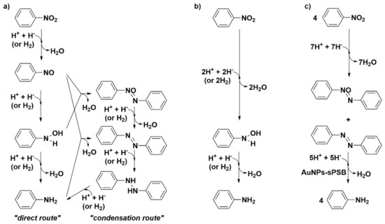 Mechanisms for nitroarene reduction catalyzed by AuNPs: (a) Haber’s general mechanism; (b) conventional route over AuNPs; (c) route over AuNPs-sPSB (see reference [68]). Adapted with permission from reference [68].