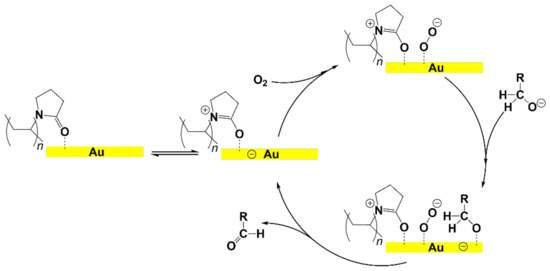 Following the pioneering studies on the oxidation of glucose [118] and glycerol [119] catalyzed by AuNPs supported on carbon (AuNPs-C), Tsukuda reported the aerobic oxidation of benzyl alcohol promoted by monodisperse AuNPs-PVP; the reaction was carried out using water as solvent and a trifold excess of K2CO3 as co-catalyst [120]. Kinetic measurements showed that the smaller nanoparticles (1.3 nm) exhibit superior catalytic activity than the larger ones (9.5 nm) and that the AuNPs are more active of one order of magnitude than PdNPs in this reaction. Concerning the reaction mechanism, these authors calculated the energetic barrier of 20 KJ mol−1 and proposed that the cleavage of the C-H bond at the benzylic position is the rate determining step, as assessed by the large kinetic isotope effect (KIE) observed in the oxidation of p-HOC6H4CD2OH (kH/kD = 74). However, the product selectivity was in favor of benzoic acid instead of benzaldehyde, which remains the most challenging reaction product to be obtained; the main drawback of this catalyst is its recovery and reuse from the reaction solution. The X-ray photoelectron and Fourier transform infrared (FT-IR) spectroscopic analysis of the Au clusters after treatment with CO provided insight into the reaction mechanism. The electron donation from the nitrogen donor atom of PVP to the surface of the AuNPs produces a negatively charged gold cluster core that thus generates superoxo-or peroxo-like species as a result of the interaction of the LUMO (π *) of O2 with the Au core (see Scheme 2). The position of the hydroxyl group onto the phenyl ring of benzyl alcohol has a remarkable effect on the selectivity of the reaction. When located at the ortho-position, o-HOC6H4CHO is the main reaction product, whereas in meta position a mixture of aldehyde and acid was obtained; finally, p-HOC6H4CH2OH leads to the selective formation of p-hydroxyl-benzaldehyde in 91% yield.