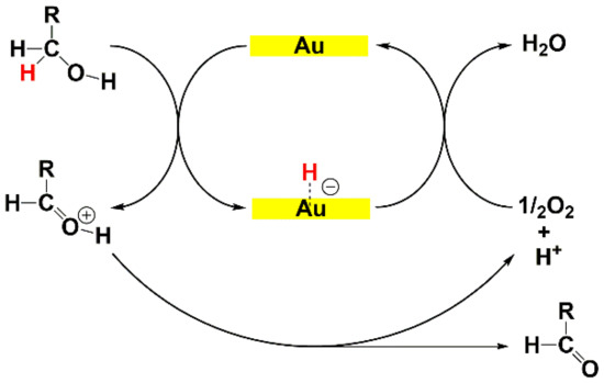 The mechanism of the oxidation of alcohols promoted by AuNPs has been extensively studied [116,131,132,133]. Garcia [132] and Kobayashi [133] independently suggested a β-elimination of hydride from the alcohol by the gold as key step in the oxidation (see Scheme 3). In detail, Kobayashi proposed that the role of the oxygen was limited to the restoration of the catalytic metal surface.