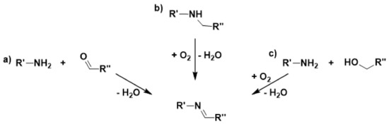 - Soulé, J.-F.; Miyamura, H.; Kobayashi, S. Selective imine formation from alcohols and amines catalyzed by polymer incarcerated gold/palladium alloy nanoparticles with molecular oxygen as an oxidant. Chem. Commun. 2013, 49, 355–357. [Google Scholar] [CrossRef]