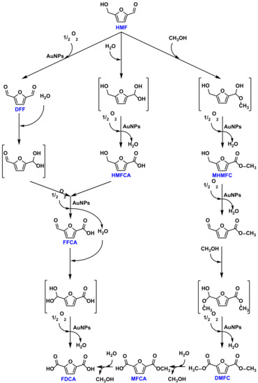 - Buonerba, A.; Impemba, S.; Litta, A.D.; Capacchione, C.; Milione, S.; Grassi, A. Aerobic oxidation and oxidative esterification of 5-hydroxymethylfurfural by gold nanoparticles supported on nanoporous polymer host matrix. ChemSusChem 2018, 11, 3139–3149. [Google Scholar] [CrossRef]