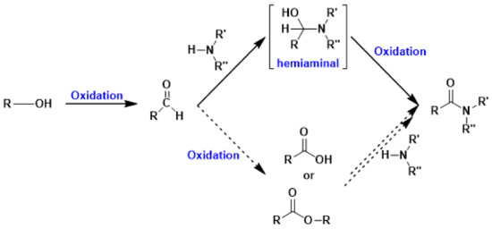 - Soulé, J.-F.; Miyamura, H.; Kobayashi, S. Powerful amide synthesis from alcohols and amines under aerobic conditions catalyzed by gold or gold/iron, -nickel or -cobalt nanoparticles. J. Am. Chem. Soc. 2011, 133, 18550–18553. [Google Scholar] [CrossRef]