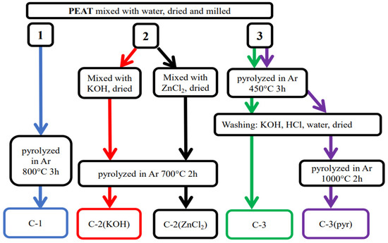 - The pre-treated peat was pre-pyrolyzed in a flow of Ar at 450 °C for 3 h. After that, a washing procedure was performed using 20 wt% KOH and then 50 wt% HCl solution. The obtained mixture was washed with Milli-Q® water, dried, and named C-3. A fifth material (C-3(pyr)) was prepared using a post-pyrolysis in Ar at 1000 °C for 2 h [10,24].
