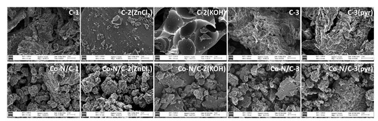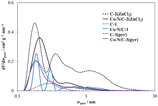 Doping these carbon support materials with cobalt and nitrogen centers influences their porosity characteristics noticeably, and after the modification the SBET values are in the range from 246 to 520 m2 g−1. Based on our previous data [23,24], co-doping highly porous carbon materials with Co and N via ball-milling decreases the specific surface area significantly. This is probably due to the fact that the pores of the carbon support material are filled to some extent with the complex compound of cobalt and 2,2′-bipyridine during the ball-milling, which is evident when comparing the pore size distributions calculated for C-2(ZnCl2) and Co-N/C-2(ZnCl2) (Figure 6). In contrast, when doping a low specific surface area carbon (C-3(pyr)) in the same way, the specific surface area and the total pore volume increase drastically. This is caused by the ball-milling and subsequent pyrolysis step, which modify the carbon structure. However, it can be seen that doping C-1 with Co and N does not affect the SBET value or the pore size distribution [24]. Therefore, we can conclude that the SBET values for the synthesized Co-N/PDC catalysts differ less (2-fold) compared with the data for undoped carbon materials (14 times).