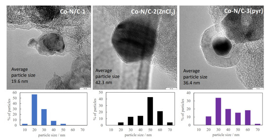 Additionally, approximately 100 cobalt nanoparticles were measured to evaluate the average cobalt particle size of the catalysts (diagrams in the bottom row of Figure 4). Although the synthesis of these Co-N/PDC catalysts was performed under the same conditions, the particle size distribution appears to depend on the carbon support material used. The average cobalt particle size was smallest in Co-N/C-1 material (19.6 nm), while in Co-N/C-3(pyr) and Co-N/C-2(ZnCl2) materials the average particle size was 36.4 nm and 42.3 nm, respectively.