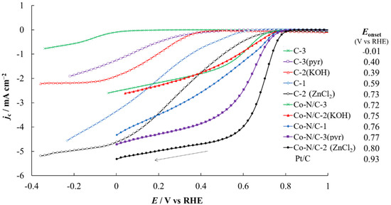 As expected, the Co and N co-doped PDC catalysts display much higher ORR activity than the undoped PDC materials (Figure 8) and the Eonset values increase in the following order: Co-N/C-3 ˂ Co-N/C-2(KOH) ˂ Co-N/C-1 ˂ Co-N/C-3(pyr) ˂ Co-N/C-2(ZnCl2). The two highest Eonset values of 0.80 V and 0.77 V vs RHE were measured for Co-N/C-2(ZnCl2) and Co-N/C-3(pyr), respectively. In general, it appears that the more active the carbon support material used in the synthesis, the more active ORR catalyst can be synthesized from it. It is worth noting that the Eonset values of the Co-N/PDC catalysts differ only by 75 mV, when the difference in Eonset values of the PDC materials was almost ten times greater, which may be because the specific surface area of the PDCs differed significantly more than that of the synthesized Co-N/PDCs. Additionally, based on HR-SEM images (Figure 2), the surface morphologies of the Co-N/PDC catalysts are similar, but the surface morphologies of the PDCs are very different. Moreover, ORR activity is highly influenced by the proportion of carbon-oxygen functionalities as well as by the total nitrogen content supported by the XPS analysis results (Figure 5 and Table 2). Comparing the Eon values of the Co-N/PDCs to the Eon value of a commercial 20% Pt/Vulcan XC-72® (Fuel Cell Earth, Woburn, MA, USA, noted as Pt/C in Figure 8) catalyst reveals that improvements can still be made to reach higher ORR activities.