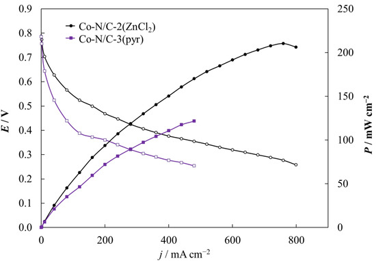Single cell experiments were conducted to investigate the electrochemical activity of the two more promising Co-N/PDC catalysts, demonstrated by RDE analysis. The polarization and power density curves for the assembled PEMFC single cells are presented in Figure 9. From the calculated power density curves, we can see that the maximum power density is almost two-fold higher for a single cell with an MEA prepared from Co-N/C-2(ZnCl2) as the cathode (210 mW cm−2) compared to a Co-N/C-3(pyr) cathode (122 mW cm−2). The single cell based on Co-N/C-2(ZnCl2) displayed better performance than Co-N/C-3(pyr) due to the presence of a higher amount of surface oxides and nitrogen as it was obtained from XPS data (Figure 5), which increase the electrochemical activity of an NPGM-type catalyst according to the literature [48]. In addition, the difference in performance correlates well to the almost two-fold difference in the specific surface area values of the studied materials, 520 m2 g−1 and 273 m2 g−1 for Co-N/C-2(ZnCl2) and Co-N/C-3(pyr), respectively. There are examples in the literature that catalysts with higher porosity have better activity in PEMFC tests [49,50].